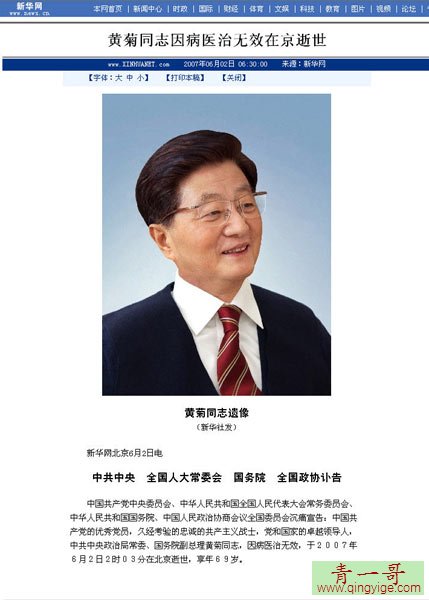 维基解密黄菊自杀:2007年6月2日2时03分,黄菊于任内病逝,享年69岁,成为中华人民共和国三十多年内在任期内去世的第一流别带领人,被中共官方评价为“中国共产党的优秀党员、久经考验的忠诚的共产主义战士、党和国家的卓越带领人”。