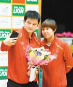 4月8日,获得男单冠军的樊振东(左)与获得女单冠军的朱雨玲在颁奖仪式后自拍。 新华社记者 马平 摄 本报讯 (记者张勇)昨天下午,在2018年亚洲...